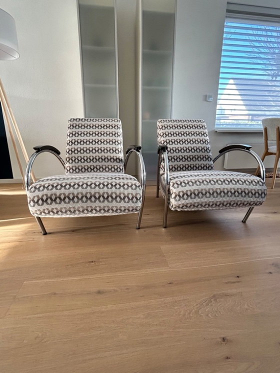 Erleben Sie die Eleganz der Gelderland Stühle Typ 5770. Diese Stühle vereinen modernes Design mit zeitloser Eleganz und passen perfekt in jeden Raum. Die geometrischen Muster in warmen Braun-, Beige- und Grautönen verleihen ihnen einen stilvollen Look. Dank des strapazierfähigen Stoffbezugs und des robusten Metallgestells bieten sie nicht nur eine ansprechende Optik, sondern auch hohen Sitzkomfort. Das ikonische Gelderland Design macht sie zu einem echten Blickfang in modernen wie klassischen Interieurs. Bereichern Sie Ihr Wohnzimmer oder Ihre Leseecke mit diesen vielseitigen Stühlen und verleihen Sie ihnen einen Hauch von Klasse.
