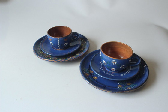 2 hochwertige Frühstücks, bzw. Kaffeegedecke handgetöpfert und handbemalt. Schöner traditioneller Dekor. In blau. Harmoniert mit Bunzlauer Keramik. In sehr gutem Vintage Zustand - siehe Fotos. West Germany pottery Bavarian cottage style in best condition. - 2 dekormäßig leicht unterschiedliche Gedecke - Der Blauton ist gleich.