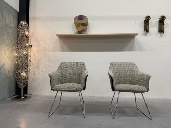 (2) Leolux Mara Outline Esszimmerstühle in Paragon Lana Stoff und Senso Chocolat Leder.