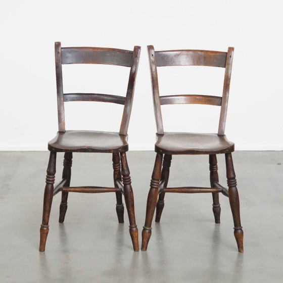 Angeboten wird dieser zeitlos elegante Satz von 2 antiken englischen Oxford Ess-/Küchenstühlen mit einer warmen Farbgebung.