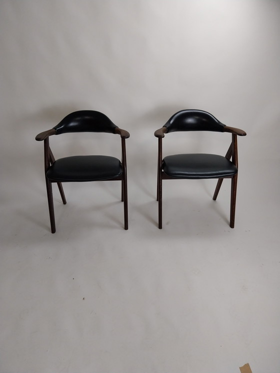 Dieses Set aus zwei Kuhhorn-Esszimmerstühlen wurde in den 1960er Jahren von Tijseling entworfen und ist ein schönes Beispiel für Mid Century Modernes Design. Die Stühle sind mit schwarzem Kunstleder gepolstert und haben ein elegantes Holzgestell. Die markante hornförmige Rückenlehne bietet Stil und Komfort. Perfekt für Liebhaber von Vintage-Möbeln. 62 x 77 x 45cm zh 45cm