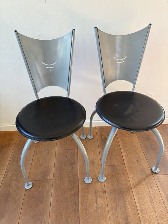 Zwei Esszimmer Stühle in interessantem Design mit einem schön gestalteten Metallrahmen und Sitzen aus schwarzem Kunstleder.