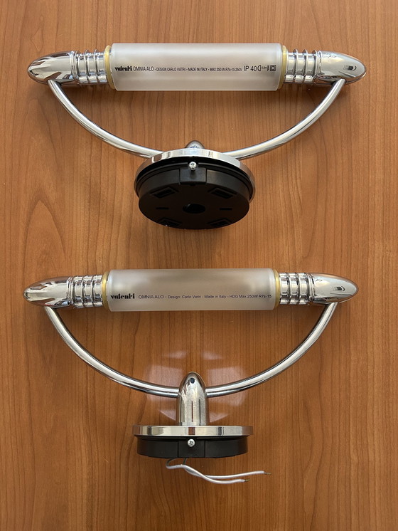 2 x Halogen-Wandleuchte aus Metall, Diffusor aus satiniertem, hitzebeständigem Glas, mit Siebdruck. Hergestellt in Italien Marke: Valenti Modell: Omnia Alo Designer: Carlo Vietri In sehr gutem Zustand, komplett mit jedem Stück und bereit, installiert werden. nur um Staub. es gibt keine Kratzer oder Brüche. original und Markenprodukte wie pro Fotos. Italienisches Design Lampen, ikonisch und zeitlos. mit modernen und Vintage-Lampen (moderne Antiquitäten) wie nobi von Fontana Arte, Tolomeo von Artemide und Nessino von Artemide kombiniert werden