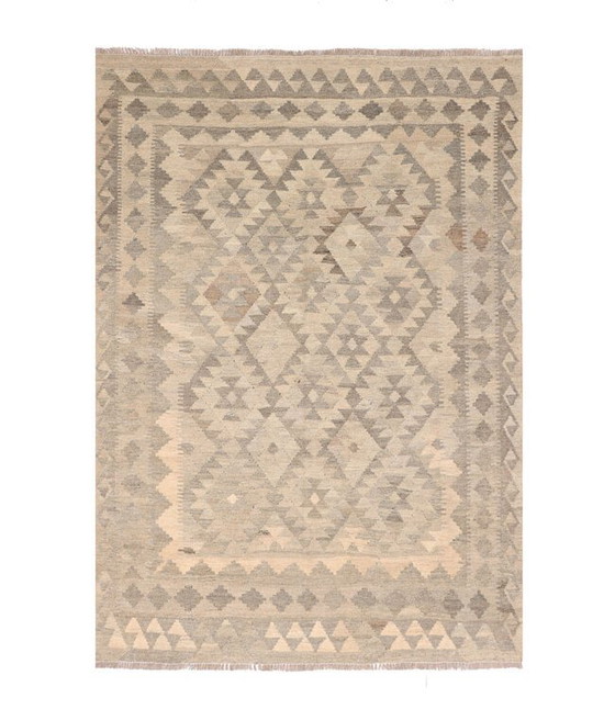 Tauchen Sie Ihr Zuhause in die zeitlose Eleganz dieses handgewebten Kelim-Wollteppichs ein. Mit seinen Maßen von 200 x 145 cm verleiht dieses exquisite Stück jedem Raum einen Hauch von Bohème-Charme – dank seiner filigranen geometrischen Muster und erdigen Farbtöne.