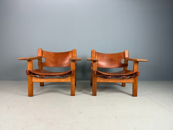 Ein wunderschönes, altes Paar der ikonischen spanischen Stühle von Børge Mogensen, Modell 226, hergestellt von Fredericia Stolefabrik, Dänemark, und bezogen mit dem originalen cognacfarbenen Sattelleder. Erworben von den Erstbesitzern, die sie Ende der 1960er Jahre erwarben.