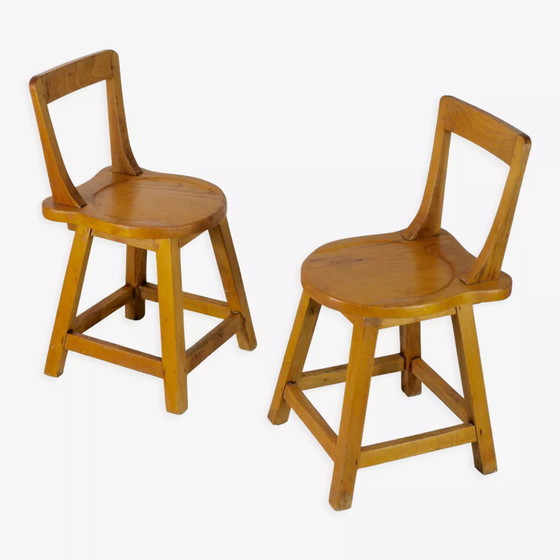 Paar brutalistische Hocker mit Rückenlehne aus Holz. Frankreich, ca. 1960. Natürliche Risse im Holz, kleine Spuren. 1 kleines Spiel ohne Folgen an 1 Rückenlehne. Fest, stabil, bequem. Emblematisches Design der 60er Jahre.