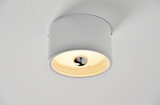 Zwei seltene, minimalistische Deckenleuchten im modernen Stil, entworfen von Cini Boeri für Arteluce im Jahr 1971. Jede Leuchte besteht aus zwei Teilen und lässt sich daher sehr einfach an der Wand montieren. Dieses Exemplar ist komplett weiß lackiert und befindet sich im Originalzustand; der Arteluce-Aufkleber ist noch an der Seite vorhanden. Arteluce war das von Gino Sarfatti gegründete Unternehmen. Die Leuchte spendet ein warmes, angenehmes Licht und wirkt auch heute noch bemerkenswert modern und zeitgemäß.