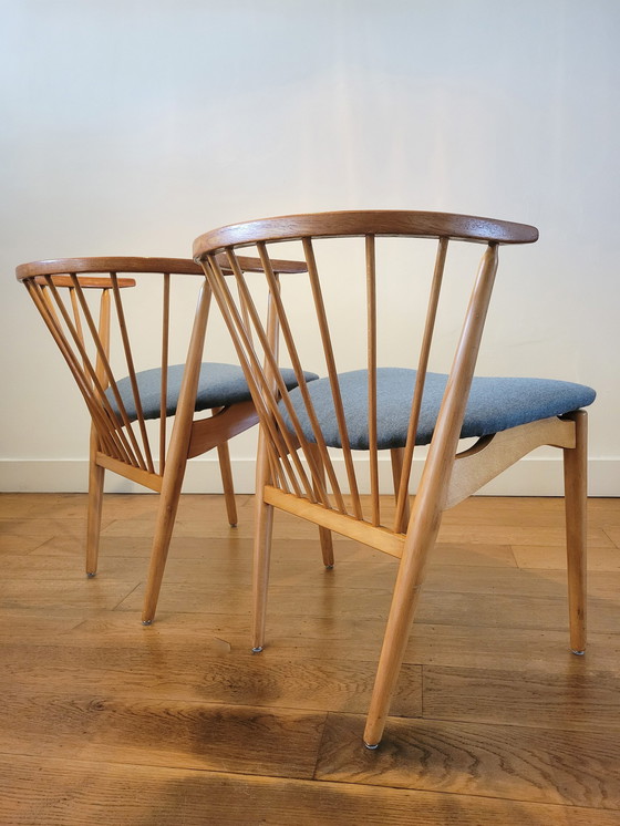 Satz von zwei Esszimmerstühlen, entworfen von Helge Sibast für Sibast Møbler im Jahr 1953 in Dänemark. Die schlanken Barstühle haben ein Gestell aus Buche. Die Stangen setzen sich etwas tiefer unter der Sitzfläche fort, was den Stühlen eine besondere und sehr erkennbare Silhouette verleiht. Die Stühle sind in einem sehr guten Vintage-Zustand mit leichten Gebrauchsspuren und einer schönen warmen Patina auf dem Holz. Die Sitze wurden neu gepolstert. Die Abmessungen sind wie folgt: Höhe 74 cm, Breite 54 cm und Tiefe 46 cm.