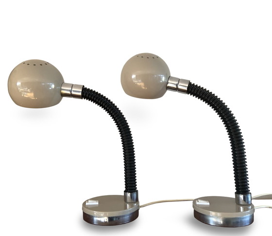 In neuem Zustand Satz von 2 identischen Herda-Lampen. Von uns auf Nachttischen verwendet. Einzigartig als Set. Schön in Lack ohne Gebrauchsspuren. Hersteller: Herda Abmessungen: H 40 cm x Ø 12 cm x Ø Sockel 12,5 cm Herkunft: Holland Farbe: hellbraun - mokka Material: Metall Elektrisch: E14 Fassung - eingebauter Schalter