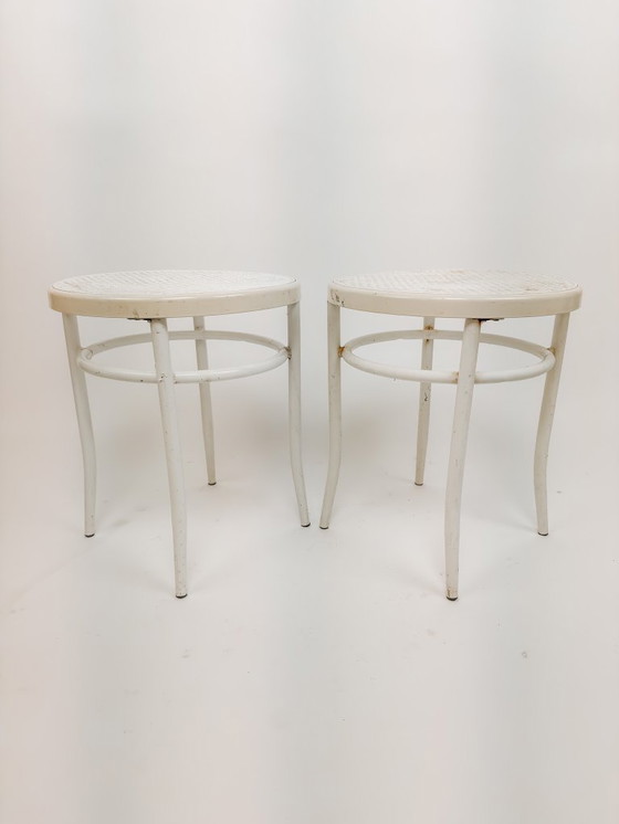 Zwei Kunststoffhocker im Thonet-Stil. Ideal für Küche, Wohnzimmer oder Garten. Sie bestehen aus Metall mit einer Sitzfläche in Flechtoptik. Sie weisen stellenweise leichte Verfärbungen auf, sind aber dennoch stabil.