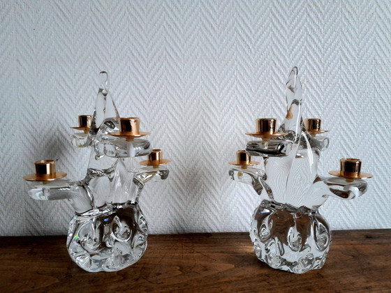 Paar Kerzenhalter, Haus Schneider um 1950/1960 Ein Paar frei geformter, vierarmiger Kristallleuchter mit Messingspulen. Auf der Rückseite mit der Spitze Schneider France signiert. In perfektem Zustand, keine Splitter. 27,5 x 18cm Sauberer, schneller und sorgfältiger Versand. Das Haus Schneider erlebte seinen Höhepunkt in der Epoche des Jugendstils an der Seite der großen Häuser wie Daum, Baccarat und Lalique. Seine eleganten und modernistischen Kreationen fanden international großen Anklang und wurden zu luxuriösen Sammlerstücken.