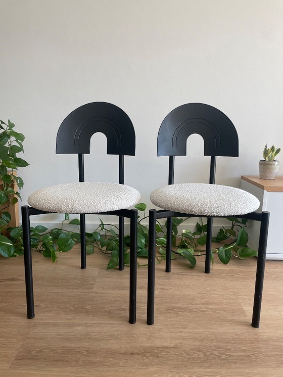 Set aus zwei postmodernen Esszimmerstühlen mit einem einzigartigen Design. Die Stühle haben ein schwarzes Metallgestell, eine Rückenlehne aus Kunststoff und einen Sitz aus cremefarbenem Bouclé-Stoff. Perfekt für ein modernes Interieur, kombinieren diese Stühle Stil und Komfort. Das Design ist minimalistisch und dennoch auffallend, ideal für ein zeitgenössisches Esszimmer.