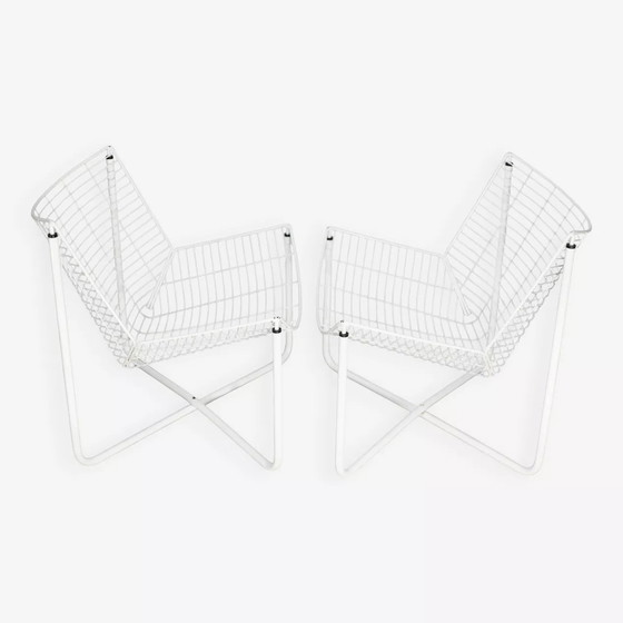 Abmessungen: H70 x B65 x T65 Farbe: Weiß Material: Metall Stil: Design Ein Paar Sessel aus weiß lackierten Stahlstäben. Circa 1985. Fest und stabil. Einige unauffällige Durchstiche und Korrosionsstellen. In gutem Zustand. Siehe Fotos. Design der 80er Jahre.