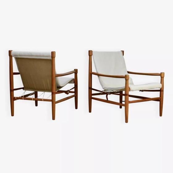 Olav Hodnebo, Schweden, ca. 1960: Ein Paar skandinavische Sessel aus Stoff, Holz, Seil und Leder. Sehr bequem, altersgemäße Abnutzung (in gutem Zustand): kleine Risse in den Lederschnürsenkeln (ohne Auswirkungen), kleine Verstärkung des Seils, siehe Fotos. Der ursprüngliche, sehr gut erhaltene Stoff wurde für zusätzlichen Komfort mit einem ecrufarbenen Bezug versehen. Skandinavisches Design. Design der 60er Jahre.