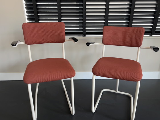 Zwei Stühle mit Rohrgestell. Gleicher Bezug, jedoch geringfügige Unterschiede im Rohrgestell und den Armlehnen. Ein Stuhl mit Bakelit-Armlehnen, der andere mit Armlehnen aus Kunststoff.
