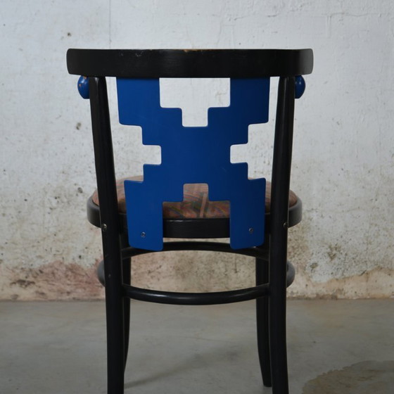 Dieses Set aus zwei X-förmigen Stühlen im Stil der 1980er-Jahre vereint kühnes Design mit funktionaler Eleganz. Die Stühle bestechen durch eine auffällige blaue Rückenlehne und einen farbenfroh gemusterten Sitz, der jedem Raum eine verspielte Note verleiht. Das schwarze Holzgestell sorgt für Stabilität, während der Canvas-Bezug Komfort und Langlebigkeit garantiert. Diese Stühle sind perfekt für Liebhaber des Retro- und Vintage-Stils und eine einzigartige Bereicherung für jedes Zimmer.