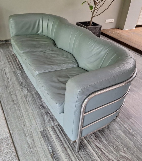 Dieses bequeme italienische Sofa ist aus außergewöhnlich hochwertigem Leder in einem wunderschönen Meeresgrün/Graugrün gefertigt.
