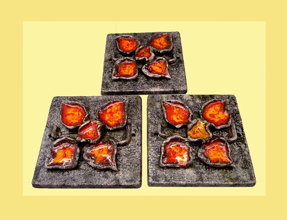 3 Wandkacheln im Fat Lava Stil, 1970er, Blüten, Blätter, Keramik