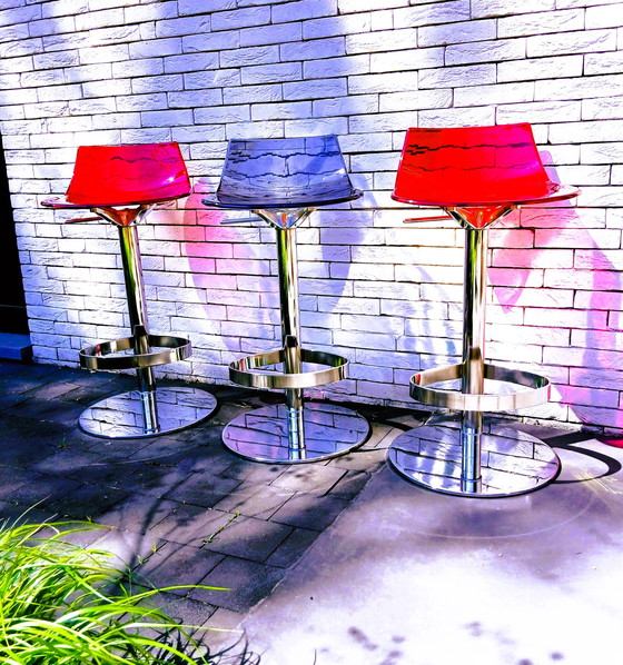 Qualität kombiniert mit purer Eleganz **** 3 Barhocker der bekannten italienischen Möbelmarke Calligaris **** Das Gestell aus verchromtem Metall ist mit einem hydraulischen Hebelsystem ausgestattet, um den Barhocker auf die gewünschte Höhe einzustellen **** Die stabile Sitzfläche aus Kunststoff hat ein einzigartiges Design mit der Illusion eines geschliffenen Diamanten **** Alles funktioniert trotzdem perfekt **** Maße: B. ca. 40 cm **** T.: ca. 32 cm **** Minimale Sitzhöhe: ca. 68 cm **** Maximale Sitzhöhe: ca. 86 cm **** Sehr robustes und stabiles Möbel, Gewicht pro Stück: ca. 17,3 kg