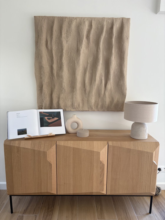 Dieses Kunstwerk ist eine 3D-Arbeit aus Gips. Arbeit von 2025, zu verkaufen aus der Hand von Original-Künstler. Es stellt die gepflasterten Strandwellen am Strand dar. 100cm x 100cm. Künstler: Lotte Collette