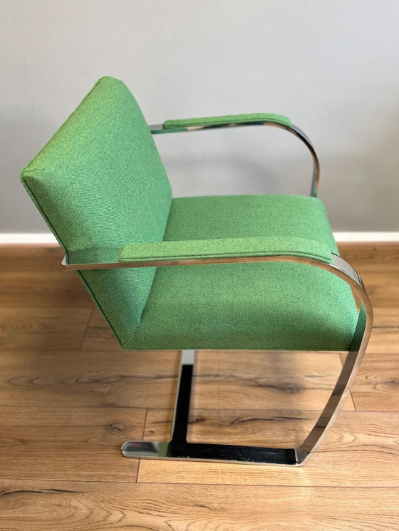 Stilvolle Stühle, entworfen von Mies van der Rohe. Was sofort auffällt, ist das zeitlose Design dieses Stuhls, der in den 1930er Jahren entworfen wurde. Die Stühle haben ein verchromtes Flachstahlgestell und einen Sitz und Armlehnen aus Stoff.