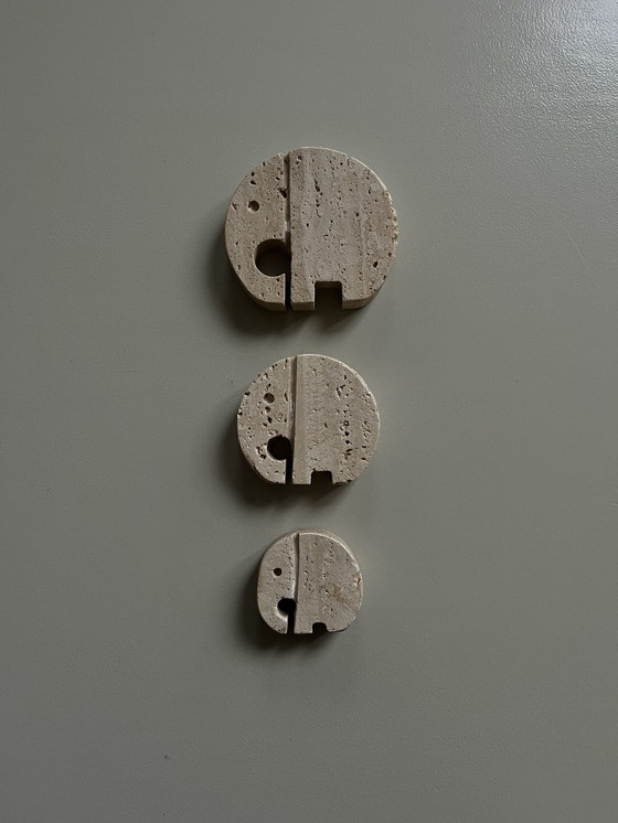 Fratelli Mannelli wurde in den 1920er und 1930er Jahren für seine Art-Déco-Möbel berühmt, die sich durch kühne geometrische Formen, luxuriöse Materialien und akribische Liebe zum Detail auszeichnen. Die Entwürfe von Fratelli Mannelli wurden auf renommierten internationalen Ausstellungen wie der Mailänder Triennale und der Pariser Weltausstellung ausgestellt. Der Stil von Fratelli Mannelli blieb bis in die späten 1950er Jahre einflussreich, danach konzentrierte sich das Unternehmen auf die Herstellung konventionellerer Möbel. Das Vermächtnis von Fratelli Mannelli in der Welt des Innendesigns ist jedoch auch heute noch von Bedeutung, und die Möbel von Fratelli Mannelli werden von Sammlern und Liebhabern des Innendesigns immer noch sehr geschätzt. Set mit 3 Elefanten aus Travertin Abmessungen: Größte: 9,7 cm x 9 cm Mittlere: 7,8 x 7,4 cm Kleinste: 5,5 x 5,2 cm