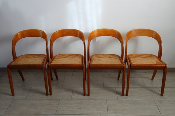 Vier Gondelstühle von Baumann aus Buchenholz mit Rohrgeflechtsitzen, aus den 1970er Jahren. Gestell und Beine sind teakfarben gebeizt, die Sitze sind mit Rohrgeflecht bezogen. Die Stühle sind elegant, bequem und hochwertig verarbeitet.