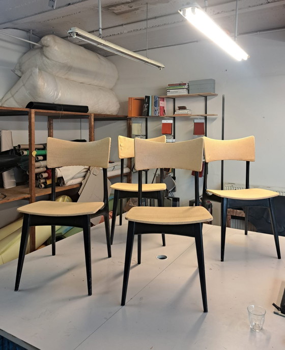 4 Esszimmerstühle im Stil von Alfred Hendrickx brauchen etwas Pflege und Aufmerksamkeit. Eine neue Schicht schwarzer Lack, einige kleinere Klebeverbindungen und eine neue Polsterung sind erforderlich.