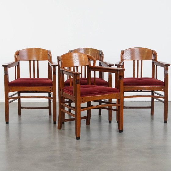Angeboten wird dieser Satz von 4 Art Nouveau / Jugendstil Design Schuitema Esszimmerstühle mit luxuriösen roten Stoffpolsterung.