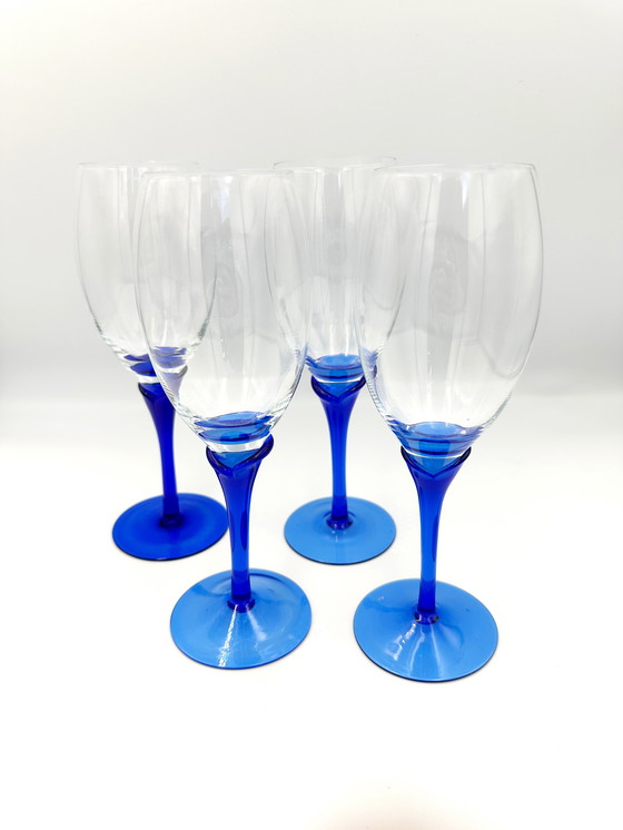 Diese mundgeblasenen Weingläser wurden in den 1980er Jahren hergestellt. Sie haben einen transparenten Kelch und einen blauen Boden mit Details. Sie sind in ausgezeichnetem Zustand.