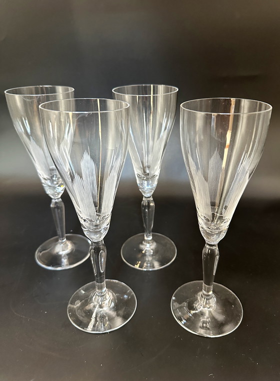 Diese 4 Sektgläser wurden in den 1950er/60er Jahren hergestellt. Sie haben ein geätztes Streifendesign. Sie sind in ausgezeichnetem Zustand.