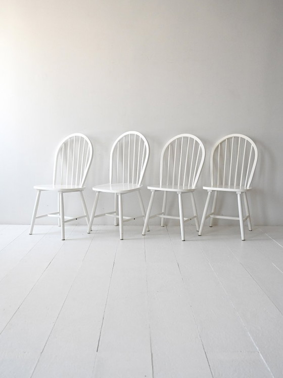 Set aus vier modernen Stühlen aus weiß lackiertem Holz, inspiriert vom ikonischen skandinavischen Design der 1960er Jahre. Die Form erinnert an das klassische Pinstolar-Modell mit geschwungener Lattenrückenlehne und großzügiger, leicht konkaver Sitzfläche. Klare, schlichte Linien verleihen diesen Stühlen eine zeitlose, vielseitige Ausstrahlung.
