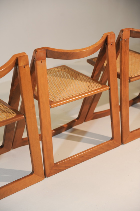 Satz von super seltenen 4x Jacober & d'Aniello "Trieste" Klappstühlen für Bazzani, 1966, Italien. Schönes Holz. Für Alberto Bazzani. Guter Vintage-Zustand. Aldo Jacober war ein italienischer Designer, der 1939 geboren wurde. Aniello Pierangela war ein italienischer Designer, der 1939 geboren wurde.