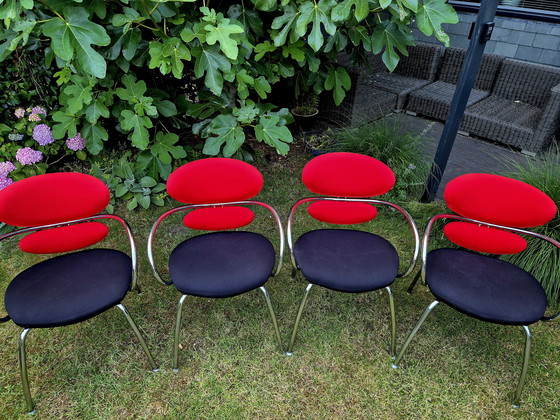 Dieses Set aus vier Effezata-Stühlen im Vintage-Stil (1980er Jahre) verbindet auffallend modernes Design mit Komfort. Der organische Stil der 80er Jahre passt gut in die heutige Zeit. Die stabilen Stühle mit hohem Sitzkomfort haben eine robuste Metall-Chrom-Konstruktion und sind mit einem leuchtend roten und schwarzen Stoff gepolstert. Perfekt für ein modernes Esszimmer. Die Stühle sind in einem gebrauchten Zustand.