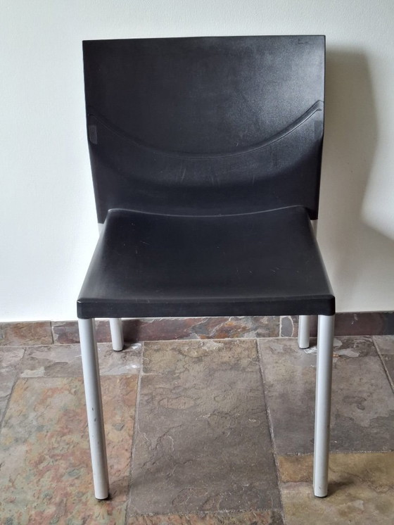 4 stilvolle Leolux Myto Esszimmerstühle in klassischem Schwarz. Diese Stühle sind die perfekte Ergänzung für ein modernes Interieur und vereinen Komfort mit elegantem Design. Die robuste Sitzfläche und Rückenlehne aus Kunststoff werden von stabilen Metallbeinen getragen und garantieren so einen langlebigen und sicheren Sitzkomfort.