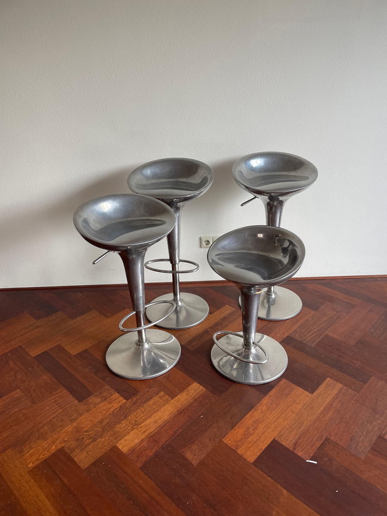 Satz von 4 Magis Bombo Barhockern, entworfen von Stefano Giovanni. Diese modernen Hocker sind aus robustem Aluminium gefertigt und bieten einen eleganten und modernen Look. Sie eignen sich perfekt für eine stilvolle Bar- oder Kücheneinrichtung und verfügen über einen höhenverstellbaren Mechanismus und eine bequeme Sitzfläche. Ideal für alle, die modernes Design und Funktionalität zu schätzen wissen.