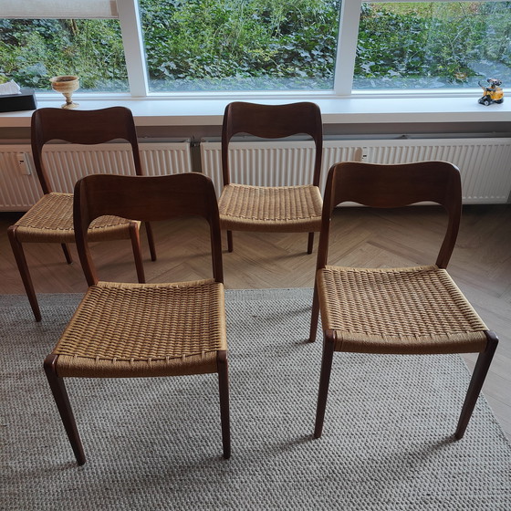 Dieses Set aus vier N.O. Møller Esszimmerstühlen ist aus edlem Teakholz gefertigt und hat klassische, handgewebte Sitzflächen aus Papierkordel. Dänisches Design in Perfektion: elegant, komfortabel und unglaublich hochwertig verarbeitet.