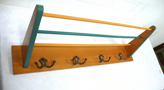 50er 60er Garderobe Hakenleiste mit Hutablage, 4 Doppelhaken auf Buche Rahmen mit Grün und Orange, Mid Century Modern