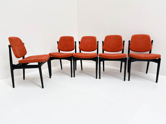 Dieses exquisite Set aus fünf Mid-Century-Modern-Stühlen, entworfen vom berühmten dänischen Architekten Arne Vodder und hergestellt von France & Son, verkörpert die perfekte Mischung aus skandinavischer Handwerkskunst und funktionaler Eleganz. Mit ihrem eleganten schwarzen Holzrahmen und der Polsterung in sattem Brandorange spiegeln diese Stühle Vodders charakteristische Liebe zum Detail und zur ergonomischen Form wider. Die leicht gebogenen Rückenlehnen und die konturierten Sitze bieten sowohl ästhetische Raffinesse als auch Komfort. Mit ihrer raffinierten Silhouette und den hochwertigen Materialien sind diese Vintage-Stühle ein Blickfang, ideal für Sammler und Designliebhaber gleichermaßen.