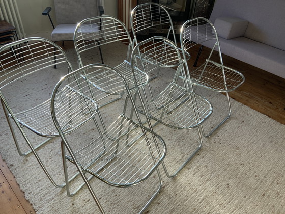 Wir präsentieren Ihnen ein Set aus sechs klappbaren Aland-Drahtstühlen – eine Vintage-Kreation von Niels Gammelgaard für Ikea. Die Stühle aus verchromtem Metall bestechen durch ihr elegantes, modernes Design und fügen sich nahtlos in jedes Ambiente ein. Dank ihres Klappmechanismus sind sie sowohl für drinnen als auch für draußen geeignet und lassen sich leicht verstauen.