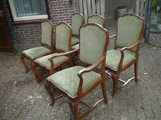 6 antike Eichen-Esszimmerstühle 2 mit Armlehne Grüner Samtüberzug