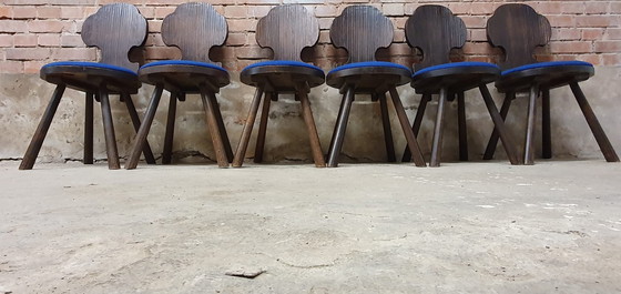Ein Satz von 6 Stühlen im brutalistischen Stil, die aus einem Herrenhaus stammen. Sie zeichnen sich durch ihr robustes Design und ihre dicken Beine aus. Die Sitze sind aus Massivholz mit einer blauen Textilbespannung, die einen optimalen Sitzkomfort bietet. Perfekt, um Ihrer Einrichtung einen Hauch von Charakter zu verleihen.