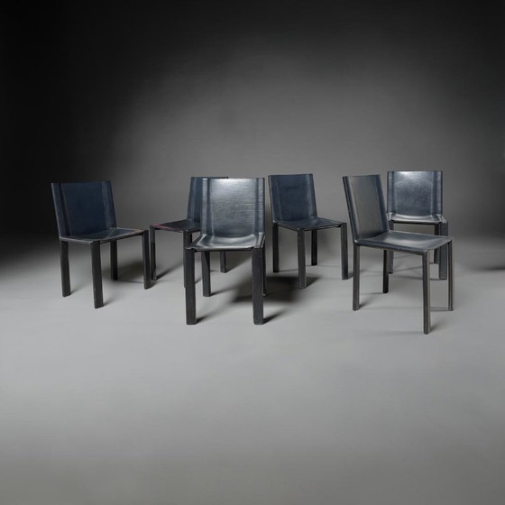 Sechs Esszimmerstühle aus dickem, schwarzem Gartenleder, entworfen von Carlo Bartoli für Matteo Grassi, Italien.