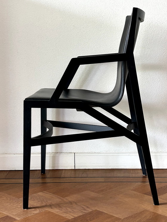 Das Gestell des Pilotta-Stuhls besteht aus schwarz gebeiztem Eschenholz und die Sitzschale ist mit flexiblem Polyurethanleder bezogen. Die Stühle wurden von Rodolopho Dordoni entworfen.