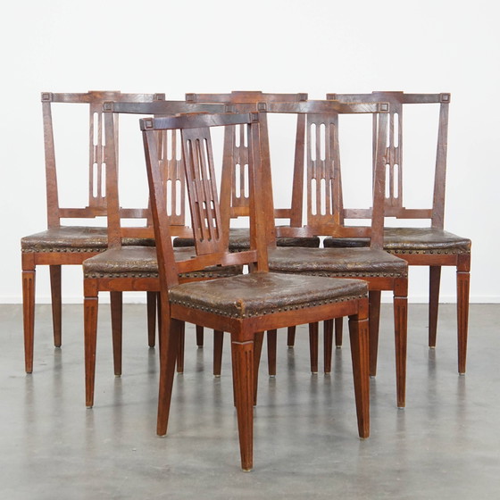 Dieses Set von 6 fantastischen antiken holländischen Esszimmerstühlen hat einen ausdrucksstarken Charakter und ist ein echter Blickfang. Die Stühle stammen aus dem späten 18. und frühen 19. Jahrhundert und sind mit dem Originalleder bezogen. Aufgrund ihres hohen Alters haben sie eine schöne Patina angenommen. Die Sitze sind wunderschön gemustert, mit einzigartigen, einprägsamen und vor allem originellen Farben. Durch den jahrelangen Gebrauch haben sie Gebrauchsspuren, siehe Fotos. Strukturell sind sie in einem guten und natürlich sofort benutzbaren Zustand. Bei angemessener Nutzung und Pflege werden Sie viele Jahre lang Freude an diesen wunderbaren Esszimmerstühlen haben. Werden sie Ihr Interieur bereichern?