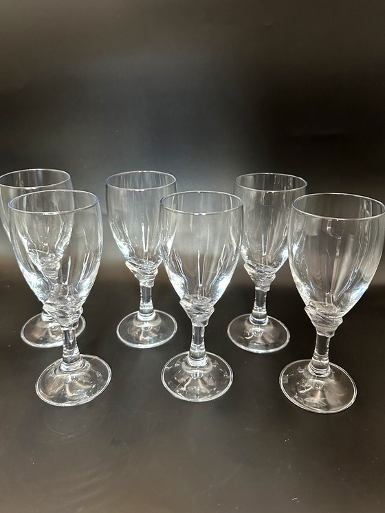 Satz von 6 Wassergläsern aus den 1980er Jahren. Die Gläser sind kelchförmig und haben einen Boden mit einem gedrehten Detail.