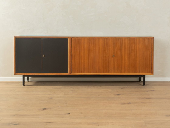 Klassisches Sideboard aus den 1960er Jahren. Hochwertiger Korpus in Nussbaumfurnier mit vier Türen, zwei Einlegeböden und neuen Vierkantstahlfüßen in Schwarz. Zwei Türen und die Platte sind mit schwarzem Formica beschichtet. Hergestellt in Deutschland, Design: Lothar Wegner.