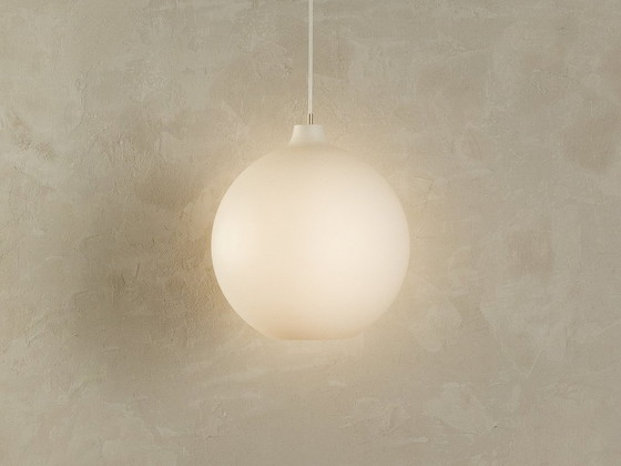 XXL-Deckenleuchte im skandinavischen Stil aus den 1960er Jahren. Lampenschirm aus mattiertem Glas mit Metallaufhängung (E27-Fassung). Die Lampe wurde neu verkabelt. Hergestellt in Deutschland. Länge mit Kabel 152 cm Ref 2501040
