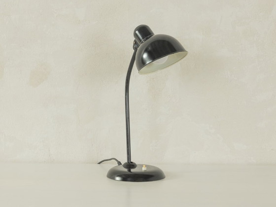 6556 Tischleuchte aus den 1930er Jahren von Christian Dell für Kaiser Idell. Diese Tischleuchte aus der Kaiser Idell-Kollektion ist eine Ikone der Bauhaus-Ära und besteht aus einem Lampenschirm aus schwarz lackiertem Stahl, einem verchromten, vernickelten Schwanenhals und einer E27-Fassung aus Bakelit. Qualitätsmerkmale: sehr gute Verarbeitung, hochwertige Materialien, made in Germany, Hersteller: Kaiser Idell, Design: Christian Dell.