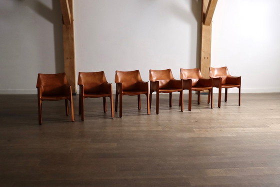 6er-Set Cassina CAB Esszimmerstühle mit Armlehnen in cognacfarbenem Leder von Mario Bellini, Italien, 1970er Jahre